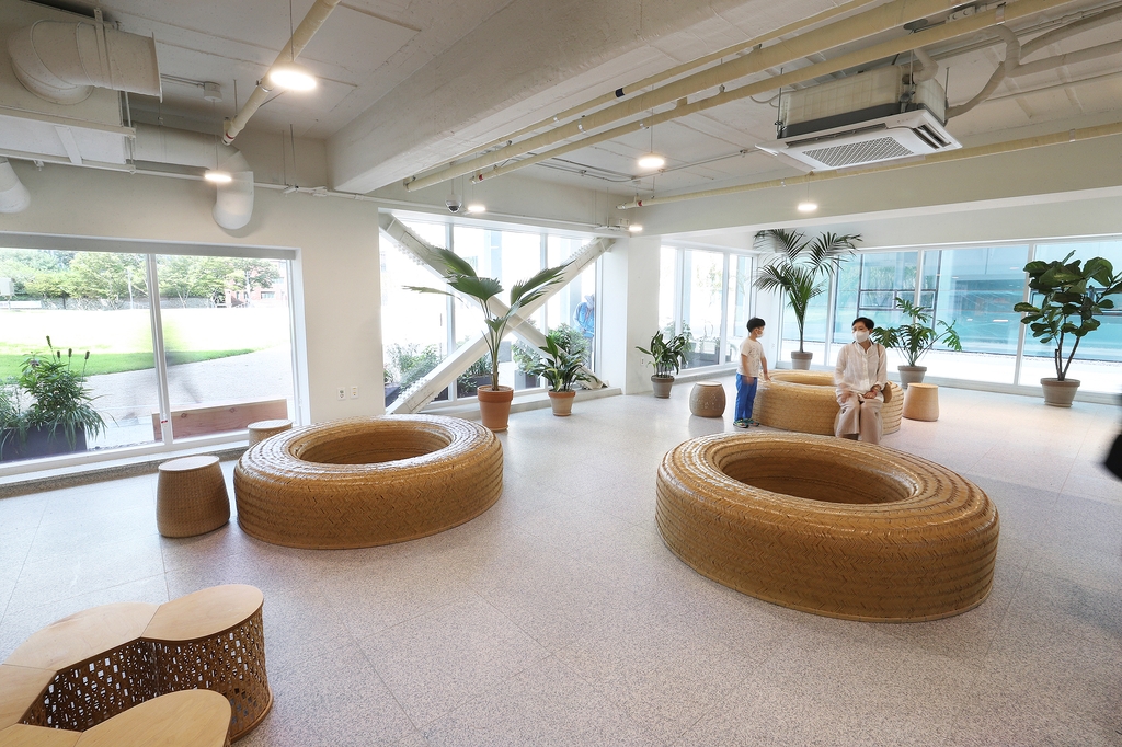 이뿐만이 아니다. 독특하게 생긴 안내 데스크도, 로비 천장에 매달린 조형물도, 박물관 복도와 마당에 놓여있는 의자들도 모두 작가가 만든 공예품들이다.