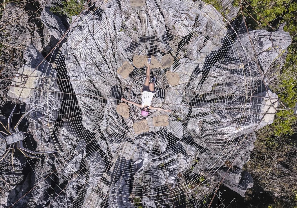 | ▲ 석회암 카르스트 지형 위에 설치된 거미줄 모양의 구조물에서 한 트레킹 참가자가 누워서 포즈를 취하고 있다. [필리핀관광청 제공] |