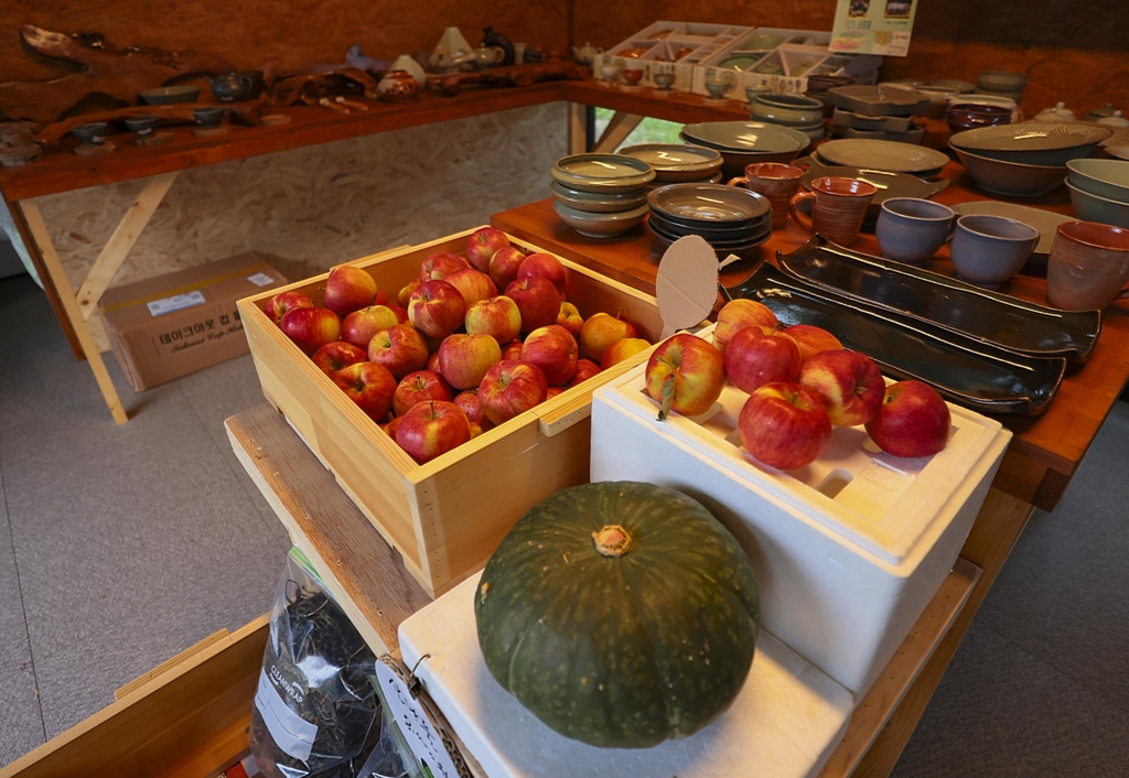 테라스 앞쪽에는 정씨가 재배한 꽃 화분들이 있고, 오른쪽 농부매장에는 갓 생산된 사과와 호박, 농부들이 제작한 도자기 등 다양한 제품들이 판매되고 있다.