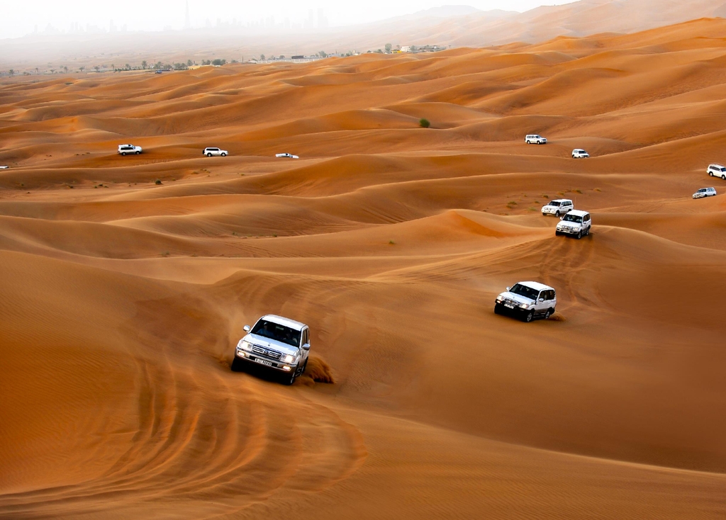 두바이 여행의 꽃이라 불리는 '사막 사파리'는 붉은빛이 도는 모래언덕을 사륜구동차를 타고 거침없이 달리는 '듄 배싱'(Dune Basing)으로 시작된다.