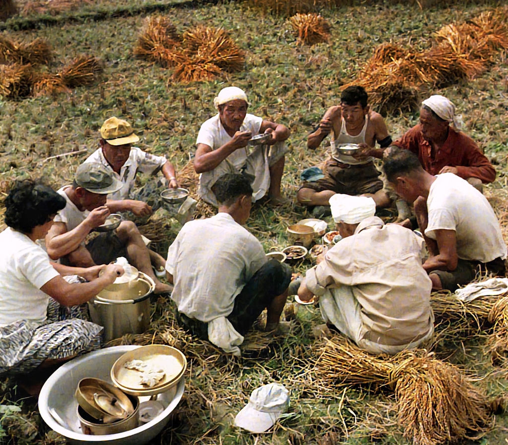 | ▲ 나락(벼)을 베다 논바닥에 둘러앉아 점심을 먹는 농부들. 1975년 [국가기록원 제공] |