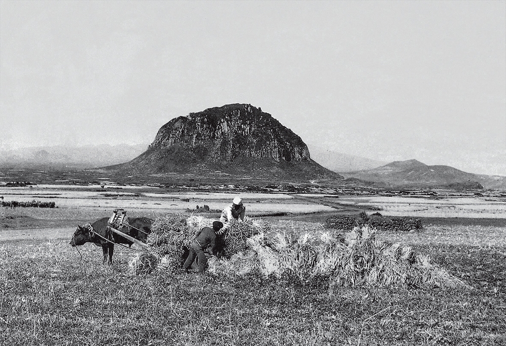 | ▲ 제주도 산방산이 보이는 들에서 소달구지로 수확물을 옮기는 농부들. 1963년 [연합뉴스 자료사진] |