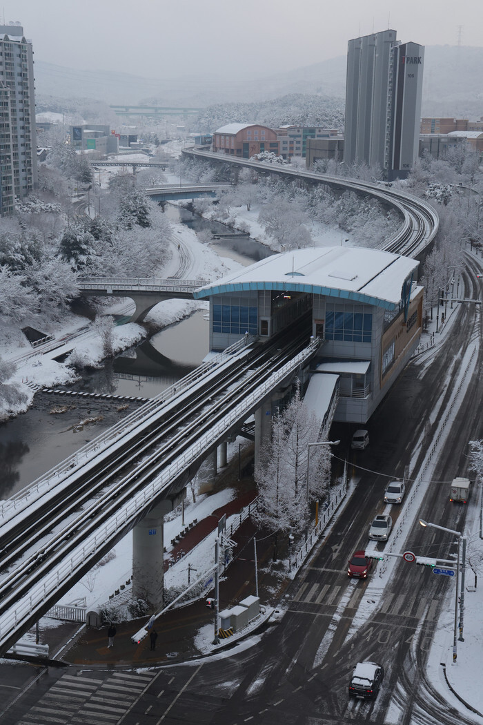 This photo, taken March 18, 2025, shows a light rail station in Uijeongbu, northeast of Seoul, whose service was suspended due to heavy snowfall overnight. (Yonhap)