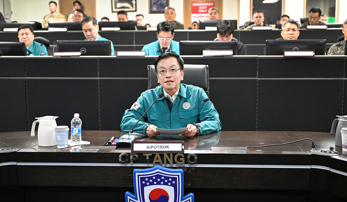 Acting President Choi Sang-mok (C, front) visits CP Tango, or Command Post Theater Air Naval Ground Operations, in Seongnam, south of Seoul, on March 18, 2025, in this photo released by the finance ministry. The visit came after South Korea and the United States' joint annual military exercise Freedom Shield kicked off March 10 for an 11-day run. (PHOTO NOT FOR SALE) (Yonhap)