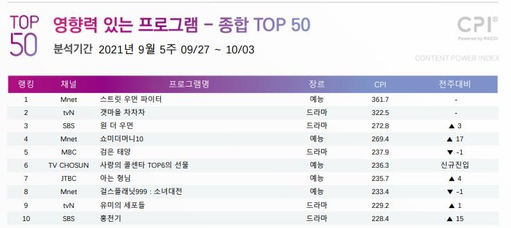 CPI 10위권을 보면 SBS 드라마 '홍천기'가 15단계 올라 10위로 재진입했고, 특집으로 편성된 TV조선의 '사랑의 콜센타 TOP6의 선물'이 6위로 신규 진입했다. 1위는 여성 댄서들의 쿨하면서도 화려한 배틀로 호평받는 엠넷 '스트릿 우먼 파이터'(CPI 지수 361.7), 2위는 신민아, 김선호 주연의 로맨스코미디 '갯마을 차차차'가 지난주에 이어 자리를 지켰다.