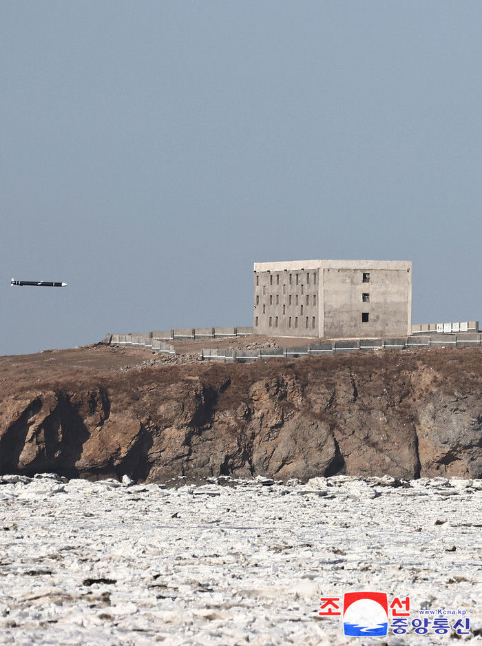 A strategic cruise missile launched by North Korea flies en route to its target in a drill off its west coast on Feb. 26, 2025, in this photo released by the North's official Korean Central News Agency on Feb. 28. The launch was overseen by the North's leader Kim Jong-un. (For Use Only in the Republic of Korea. No Redistribution) (Yonhap)