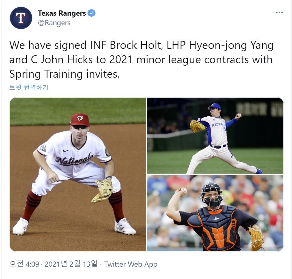 | ▲ 양현종 계약 소식 알린 텍사스 구단 [텍사스 구단 트위터 캡처. 재판매 및 DB 금지] |