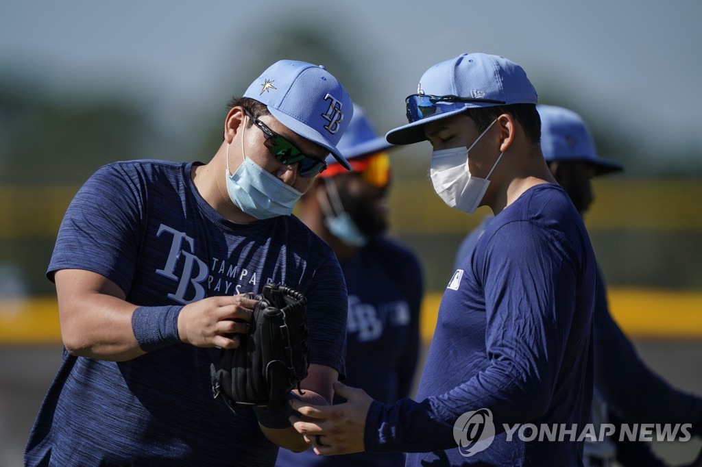 | ▲ 대화 나누는 최지만 탬파베이 레이스 최지만(왼쪽)이 27일(한국시간) 미국 플로리다주 포트 샬럿 스포츠파크에서 열린 스프링캠프 훈련에서 대화를 나누고 있다. [AP=연합뉴스] |