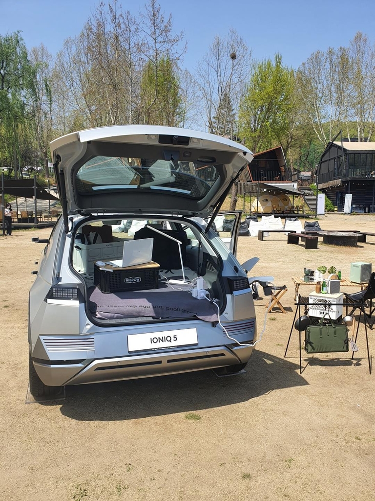 기착지에 전시된 차박(차+숙박) 콘셉트의 아이오닉 5를 보니 꽤 감성적이었다. 차량 외부로 전력을 공급할 수 있는 V2L 기능을 이용, 멀티 어댑터를 연결해 노트북과 스탠드를 사용할 수 있었다.