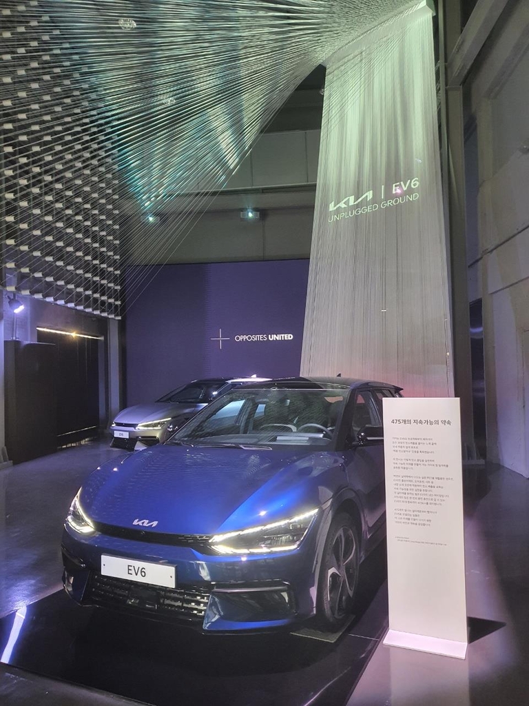 실제 EV6 생산에 사용된 폐플라스틱 섬유 원사 475개와 LED 라이팅을 활용해 기아의 탄소중립 노력과 EV6의 최대 항속거리(475㎞)를 나타낸 대형 전시물이 가장 먼저 눈에 들어왔다.