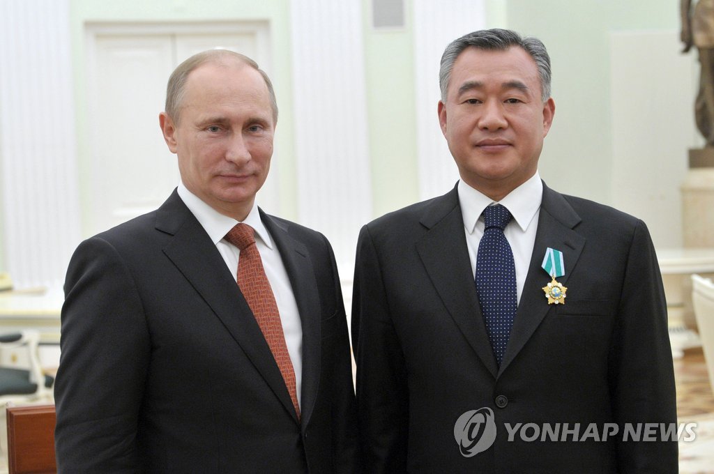 | ▲ 정헌 러시아 명예총영사와 푸틴 러시아 대통령 (인천=연합뉴스) 정헌 주한 러시아 명예총영사가 2013년 2월 크렘린궁에서 훈장을 받고 블라디미르 푸틴 러시아 대통령과 함께 찍은 사진. [주한 러시아 명예총영사관 제공, 재판매 및 DB 금지] |