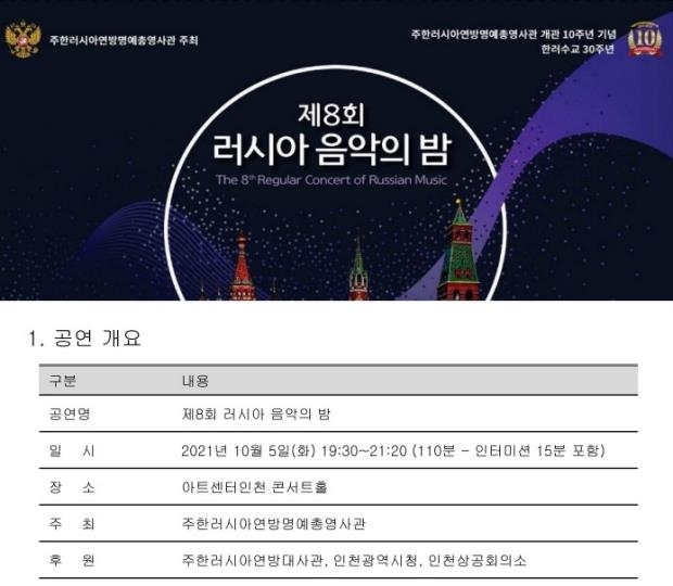 (인천=연합뉴스) 강종구 기자 = 제8회 러시아 음악의 밤 행사가 10월 5일 오후 7시 30분 아트센터인천 콘서트홀에서 주한 러시아연방 명예총영사관 주최로 열린다.