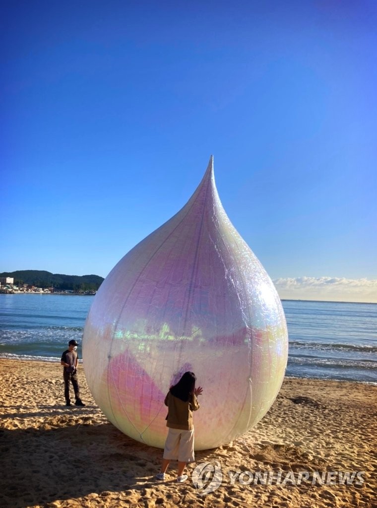 | ▲ 바다미술제…물방울 작품 (부산=연합뉴스) 부산 기장군 일광해수욕장에서 시민이 2021 바다미술제에 출품한 설치예술가 오태원 작가 작품(드롭스, DROPS)을 살펴보고 있다.[오태원 작가 제공. 재판매 및 DB 금지] |
