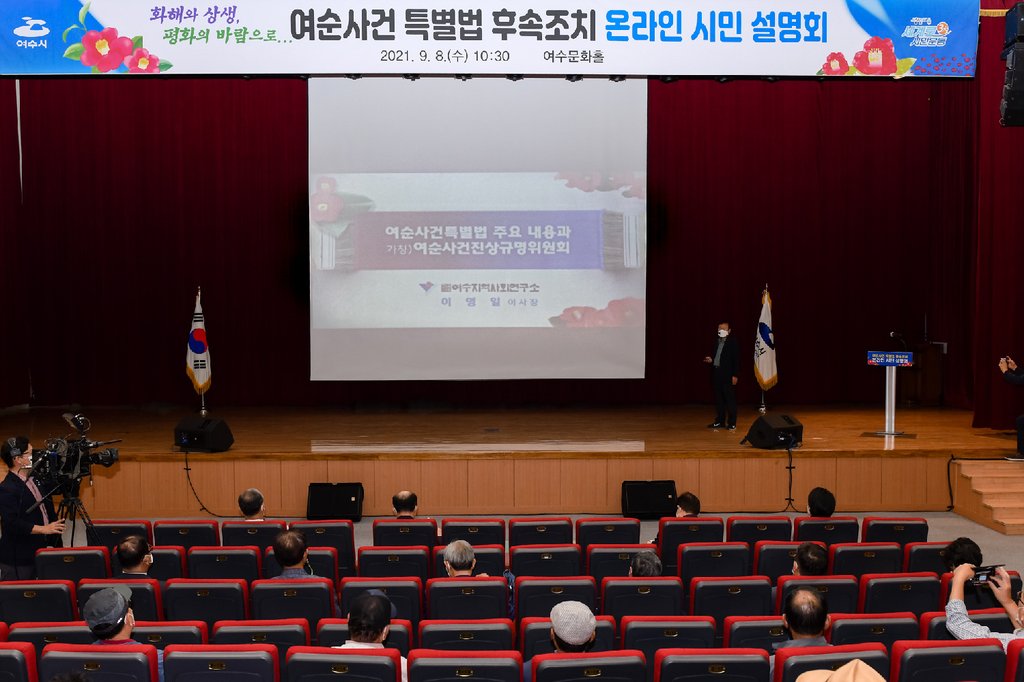 | ▲ 여수시, 여순사건 특별법 후속 조치 시민설명회 개최 (여수=연합뉴스) 8일 전남 여수시청 문화홀에서 여순사건 특별법 후속조치 시민설명회가 열리고 있다. 2021.9.8 [여수시 제공. 재판매 및 DB 금지] photo@yna.co.kr |