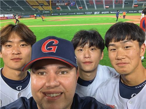 | ▲ Josh Herzenberg, director of research and development for the Lotte Giants, poses with Lotte players for a selfie, in this photo provided by Herzenberg. (PHOTO NOT FOR SALE) (Yonhap) |