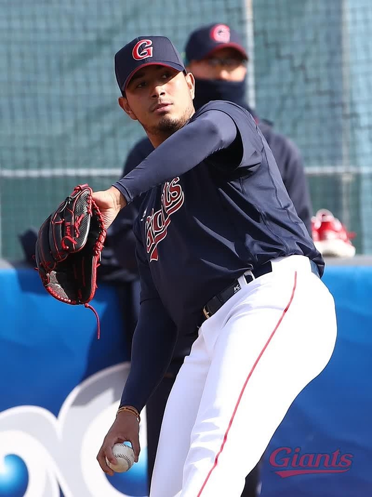 | ▲ Enderson Franco of the Lotte Giants tosses the ball during practice at Sajik Stadium in Busan, 450 kilometers southeast of Seoul, on Feb. 5, 2021, in this photo provided by the Giants. (PHOTO NOT FOR SALE) (Yonhap) |
