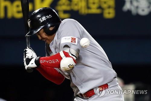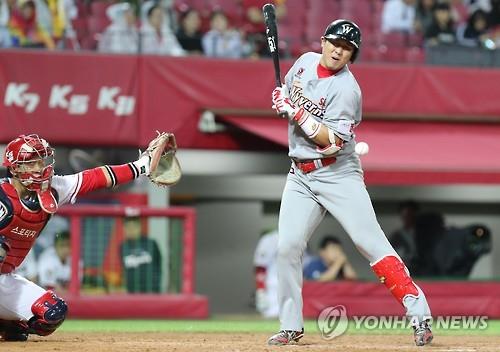 | ▲ In this file photo from April 28, 2016, Choi Jeong of the SK Wyverns is hit by a pitch from Jung Jae-hoon of the Doosan Bears in the top of the eighth inning of a Korea Baseball Organization regular season game at Jamsil Baseball Stadium in Seoul. (Yonhap) |