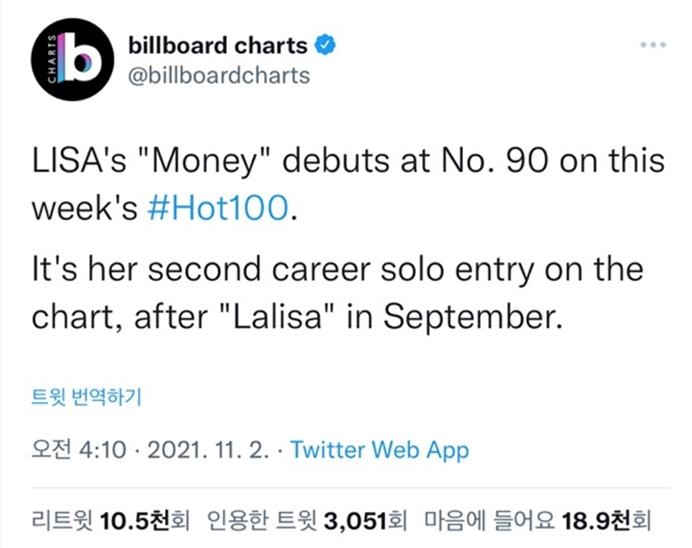 한편, 빌보드는 트위터를 통해 블랙핑크 멤버 리사의 솔로곡 '머니'(MONEY)가 '핫 100' 차트에서 90위에 올랐다고 밝혔다. '핫 100' 진입은 지난 9월 '라리사'(84위) 이후 두 번째다.