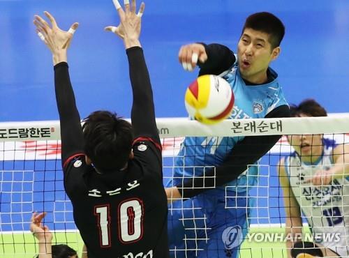 | ▲ In this file photo from Jan. 17, 2020, Park Sang-ha of the Samsung Fire & Marine Insurance Bluefangs (C) hits a spike against the KEPCO Vixtorm during a men's V-League match at Suwon Gymnasium in Suwon, 45 kilometers south of Seoul. (Yonhap) |