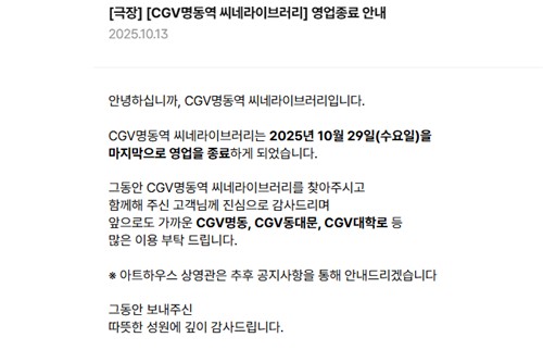 CGV 관계자는 "코로나19 이후 이어진 구조적 어려움 속에서 도심 상권 변화, 운영 효율성 등 복합적인 요인을 고려해 영업을 종료하게 됐다"고 설명했다.