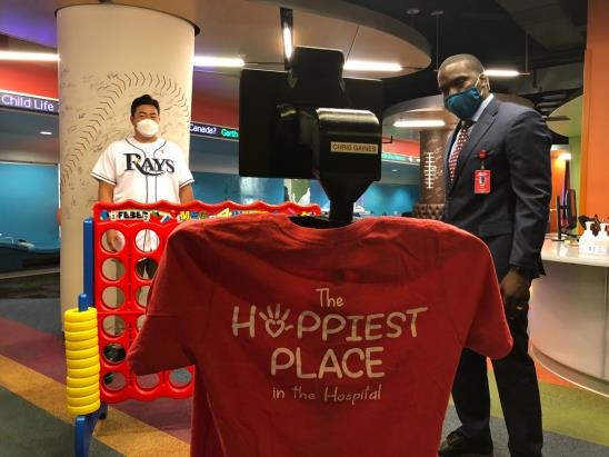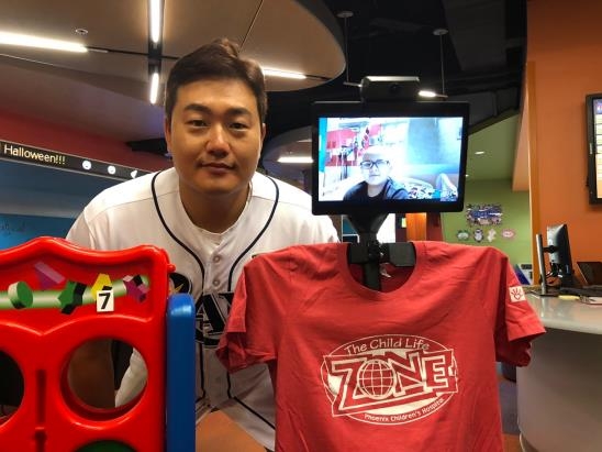 | ▲ 어린이 환자와 즐거운 시간 보내는 최지만 탬파베이 레이스 최지만이 27일(한국시간) 미국 애리조나주 피닉스 어린이병원을 방문해 화상 로봇을 통해 어린이 환자와 대화하고 있다. [GSM매니지먼트 제공. 재배포 및 DB금지] |