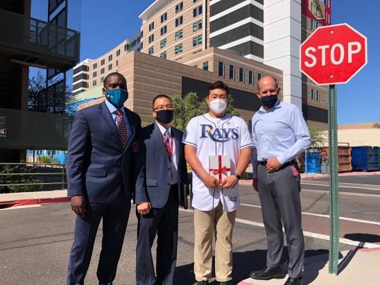 | ▲ 기부활동 한 최지만 탬파베이 레이스 최지만이 27일(한국시간) 미국 애리조나주 피닉스 어린이병원을 방문해 3만 달러를 기부한 뒤 기념사진을 찍고 있다. [GSM매니지먼트 제공. 재배포 및 DB 금지] |