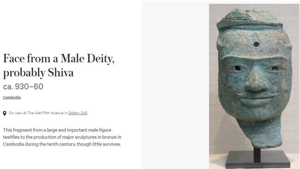 | ▲ 캄보디아 정부가 뉴욕 메트로폴리탄 미술관에 반환 요구한 45점 중 '남신의 얼굴' [뉴욕 메트로폴리탄 미술관 홈페이지 캡처. 재판매 및 DB 금지] |