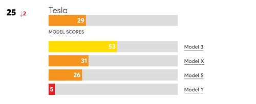 테슬라는 소비자 신뢰도 평가 100점 만점에서 29점을 받는 데 그쳤다.