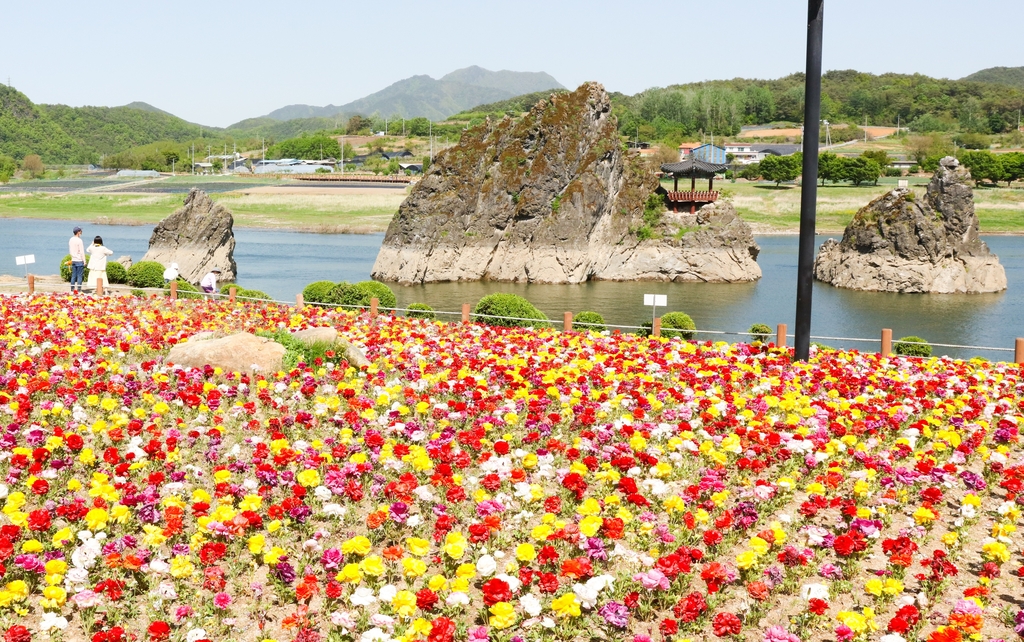 | ▲ 도담삼봉 앞에 조성된 백일홍, 석죽 [단양군 제공. 재판매 및 DB 금지] |