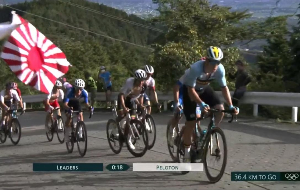 | ▲ 도쿄 올림픽에 등장한 욱일기 지난해 도쿄 올림픽 당시 무관중임에도 불구하고 사이클 남자 도로경기 중에 욱일기 응원이 등장한 모습. [서경덕 교수 제공] |