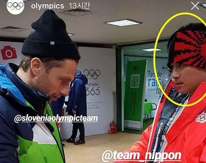 | ▲ 평창 동계올림픽에 등장한 욱일기 평창 동계올림픽 당시 IOC 공식 SNS에 욱일기 패턴 모자를 쓴 일본 선수 사진이 게재돼 논란이 된 장면. [서경덕 제공] |