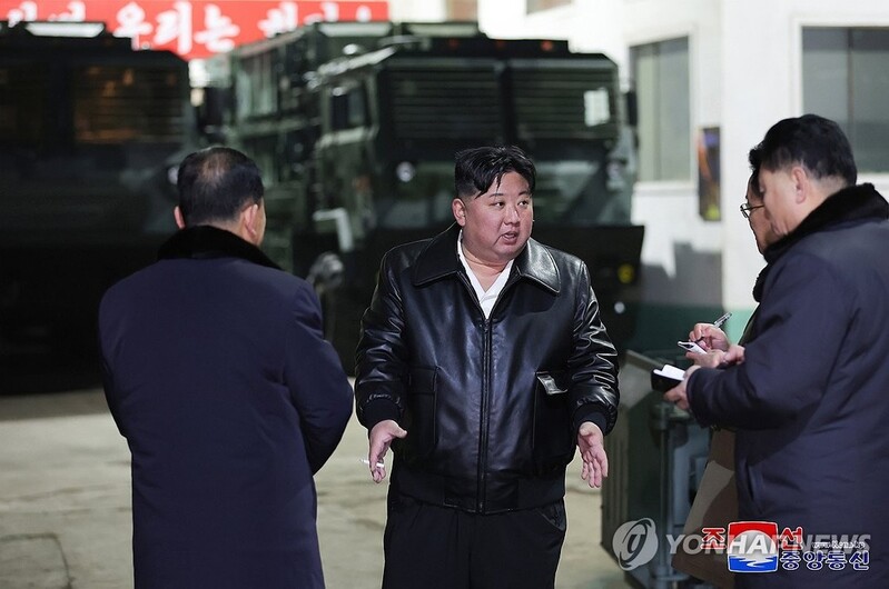 | ▲ This photo, carried by North Korea's official Korean Central News Agency on Jan. 10, 2024, shows the North's leader Kim Jong-un (C) at a key munitions factory during an inspection tour on Jan. 8-9, calling South Korea the North's "principle enemy. (For Use Only in the Republic of Korea. No Redistribution) (Yonhap) |