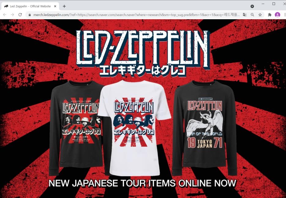 불후의 명곡 '스테어웨이 투 헤븐'(Stairway to heaven)을 부른 레드 제플린의 홈페이지에는 현재 1971년 일본에서의 첫 공연 후 50주년을 기념하는 티셔츠를 판매하고 있는데, 홈페이지 배경 화면과 티셔츠 디자인에 욱일기가 그려져 있다.
