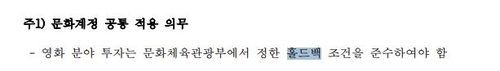 4일 문화체육관광부에 따르면 지난달 31일 정부가 조성하는 모태펀드 영화계정 관련 출자사업 공고에 '영화 분야 투자는 문화체육관광부에서 정한 홀드백 조건을 준수해야 한다'는 의무를 담았다.