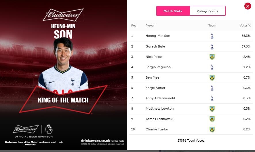 | ▲ 번리전 '킹 오브 더 매치'에 선정된 손흥민. [EPL 홈페이지. 재판매 및 DB 금지] |