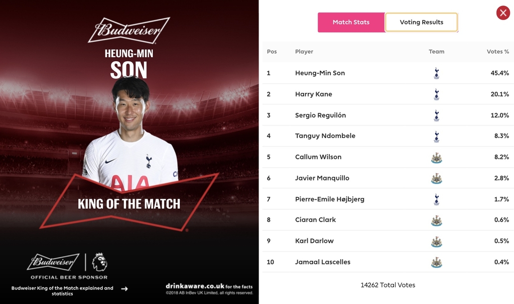 손흥민은 EPL 경기별 공식 MVP 격인 '킹 오브 더 매치'로 선정됐다. 팬 투표로 뽑는 이 상에서 1골 1도움을 올린 팀 간판 케인(20.1%)의 2배를 넘는 45.54%의 득표율을 기록했다.