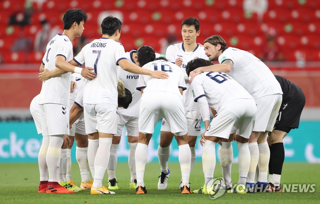 | ▲ In this Reuters photo, Ulsan Hyundai FC players huddle before the start of the second half of their fifth-place match against Al Duhail SC at the FIFA Club World Cup at Ahmed Bin Ali Stadium in Al Rayyan, Qatar, on Feb. 7, 2021. (Yonhap) |