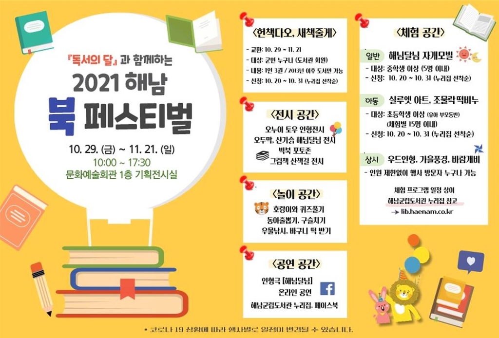 자세한 행사안내 및 문의는 누리집(https://lib.haenam.go.kr) 또는 전화(☎061-530-5890)를 통해 할 수 있다.