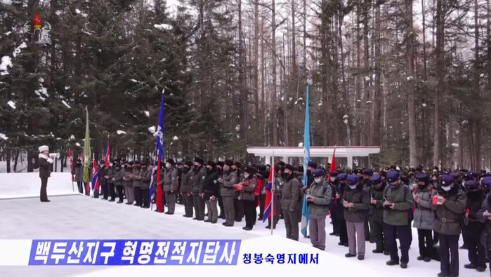 A group of North Korean students from the northeastern province of Ryanggang visits a revolutionary battle site on Mount Paektu, located on the North Korea-China border, in this photo captured from the North's official Korean Central Television on Jan. 17, 2023. For North Koreans, the mountain, the highest peak on the Korean Peninsula and a sacred site as the late North Korean leader Kim Jong-il's birthplace, is regarded as the home of their revolution. (For Use Only in the Republic of Korea. No Redistribution) (Yonhap)