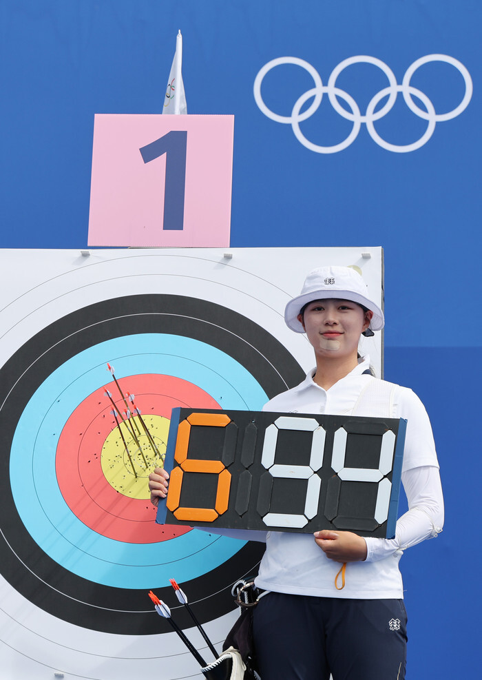 South Korean archer Lim Si-hyeon poses with the scoreboard showing her new world record mark of 694 points in the women's individual ranking round of the Paris Olympics at Les Invalides in Paris on July 25, 2024. (Yonhap)