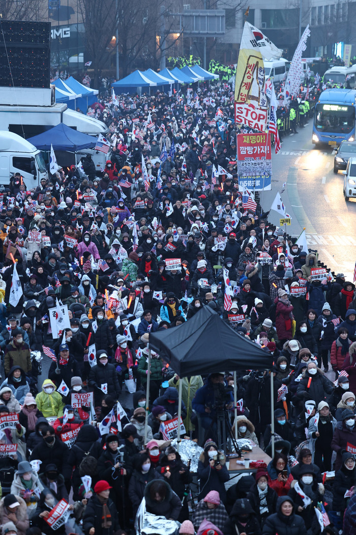 People chant slogans near the official residence of impeached President Yoon Suk Yeol in Seoul on Jan. 6, 2025, to voice their objection to the execution by the state anti-corruption agency of a detention warrant over his short-lived martial law declaration. (Yonhap)