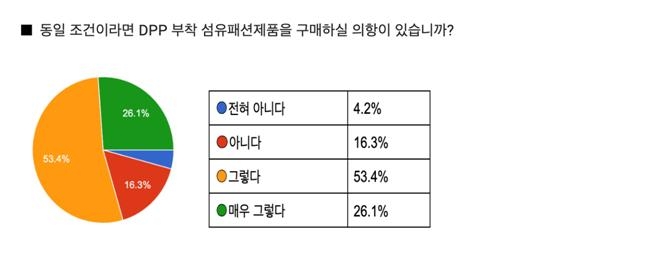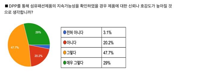 응답자의 79.5%는 같은 조건이라면 DPP가 부착된 섬유·패션 제품을 구매할 의향이 있다고 답했고 '섬유제품에 DPP를 부착하는 것이 필요하다'고 답한 비율은 77.3%로 집계됐다.