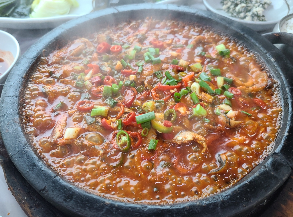여기서 가장 중요한 멸치찌개는 달콤, 매콤한 양념이 밴 큼직한 멸치와 함께 자작한 국물에 끓여 나온다.