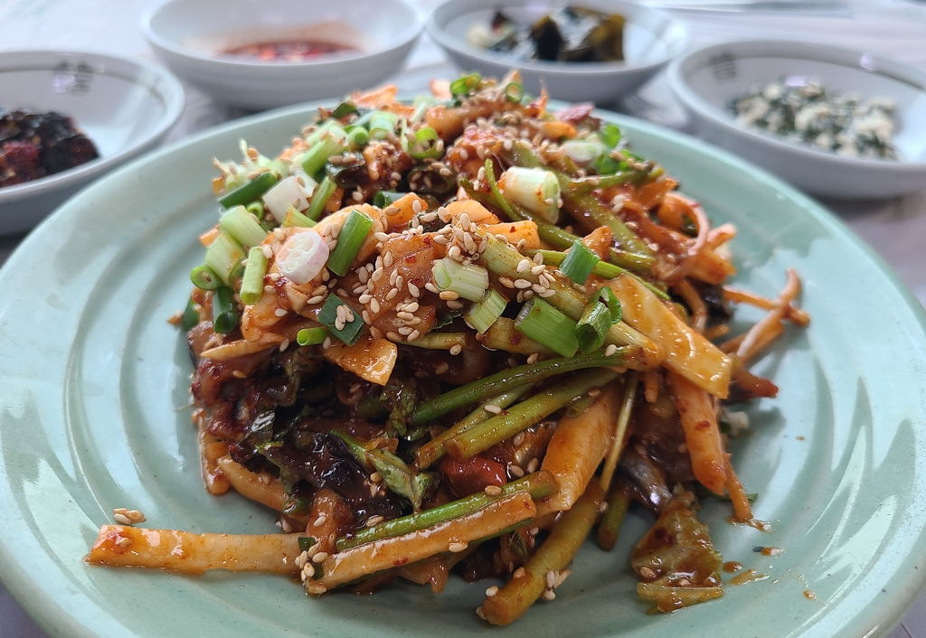 매콤한 초고추장 양념에 무, 상추 등 채소와 버무려진 멸치회무침을 한번 먹으면 입안에서 고소함이 퍼진다.