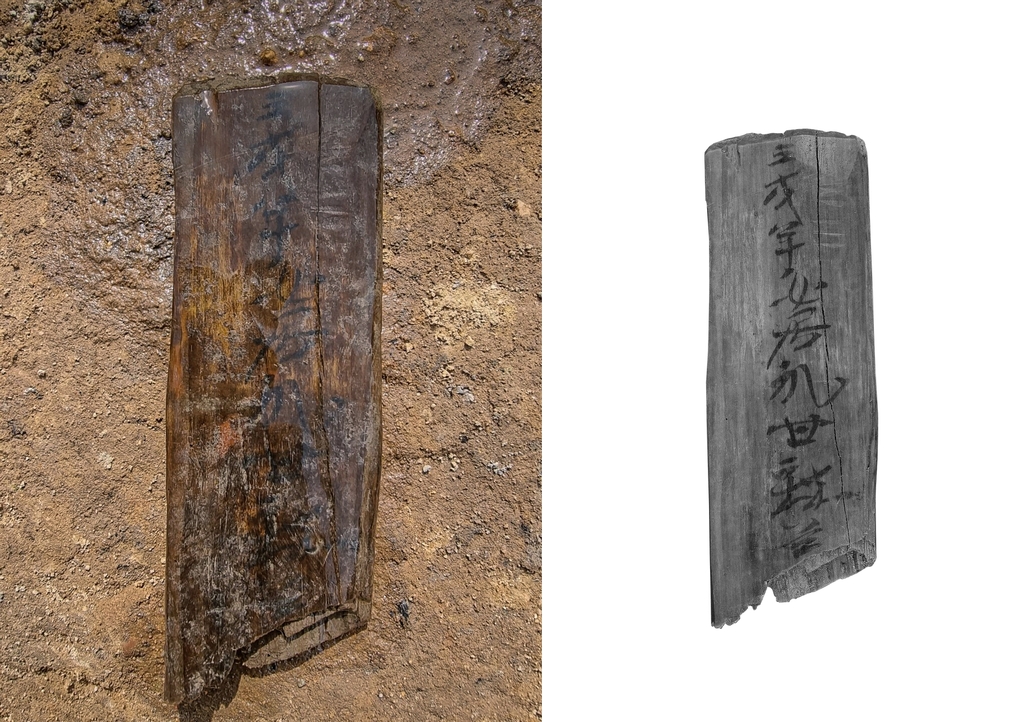 ▲ '壬戌年'(임술년) 글자가 확인된 1호 목간 출토 당시(왼쪽) 모습과 적외선 사진 [국립경주문화재연구소 제공. 재판매 및 DB 금지]
