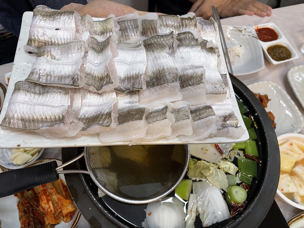 팔팔 끓여 나온 육수에 부추, 깻잎, 버섯 등을 넣은 뒤 갯장어를 살짝 데쳐 먹는다.