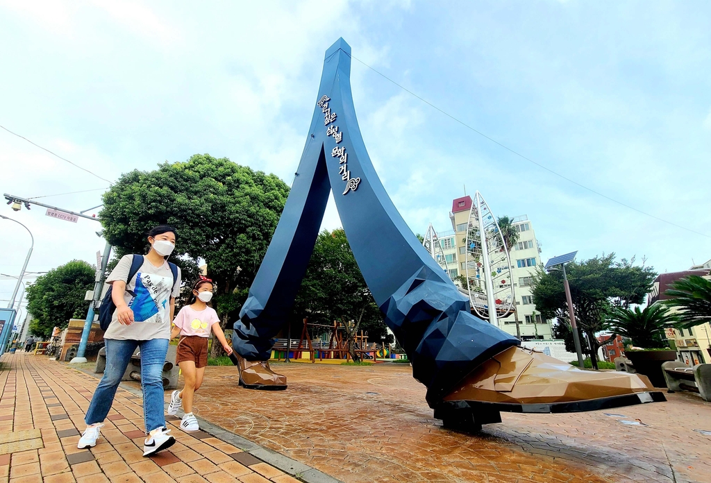 ▲ 삼성혈 문화의거리 조형물 (제주=연합뉴스) 변지철 기자 = 지난 12일 촬영한 제주시 이도1동 삼성혈 문화의 거리에서 세워진 조형물. 일명 '걷는 사람'이란 뜻의 김종철 작가의 작품 '호모워커스'(Homo Walkers)다. 2021.9.19