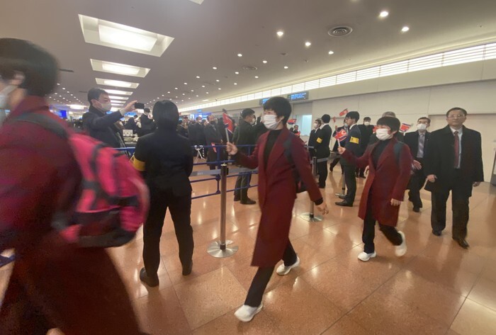 Members of the North Korea women's national soccer team arrive at Narita airport in Tokyo on Feb. 25, 2024, three days ahead of their second match against Japan in the final Asian qualifying round for the Paris Olympics. (Yonhap)