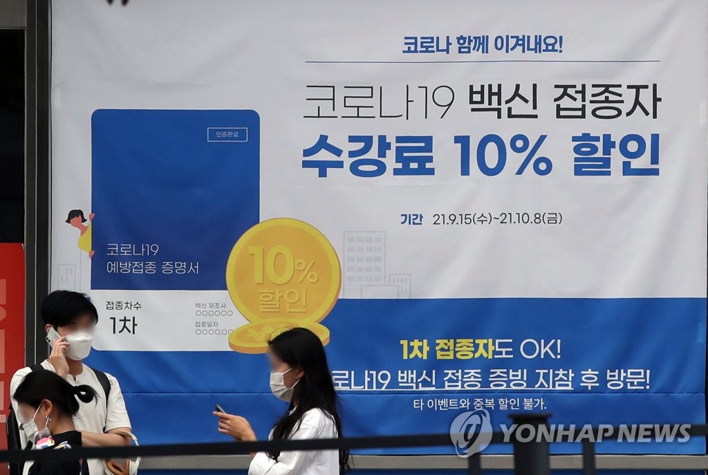 | ▲ 학원도 '백신 인센티브' (서울=연합뉴스) 임헌정 기자 = 28일 서울 서대문구의 한 학원에 코로나19 백신 접종자 수강료 할인 안내 현수막이 걸려 있다. 2021.9.28 kane@yna.co.kr |
