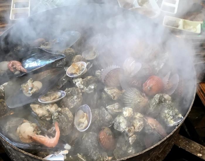 갓 캔 싱싱한 생굴을 드럼통을 개조해 만든 커다란 쇠 구이판에 껍질을 까지 않은 채 한 그득 올려놓고 뚜껑을 덮은 후 20분쯤 장작불을 땐다.